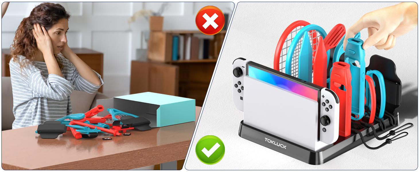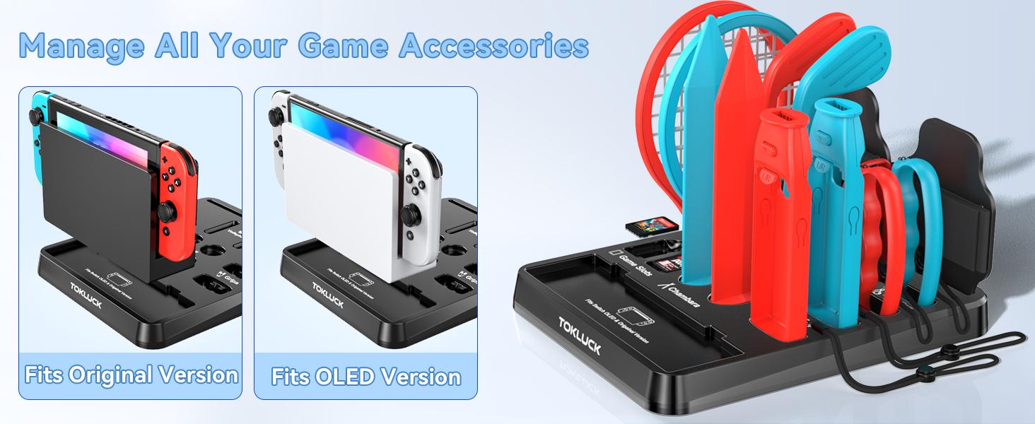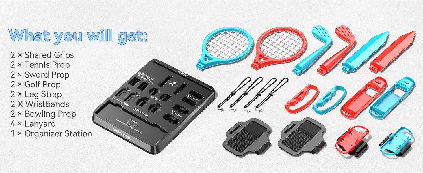 Manage and Display Switch Sports Games Accessories: The Tokluck Switch sports accessories kit comes with an organizer stand that has specially designed slots for storing game accessories. Each slot is screen printed with the name of the corresponding Nintendo Switch accessory, making it quick and easy to find what you need. With this storage stand, you can keep your accessories organized and ready for play, avoiding the chaos of having them scattered on your desktop and saving you time and effort.